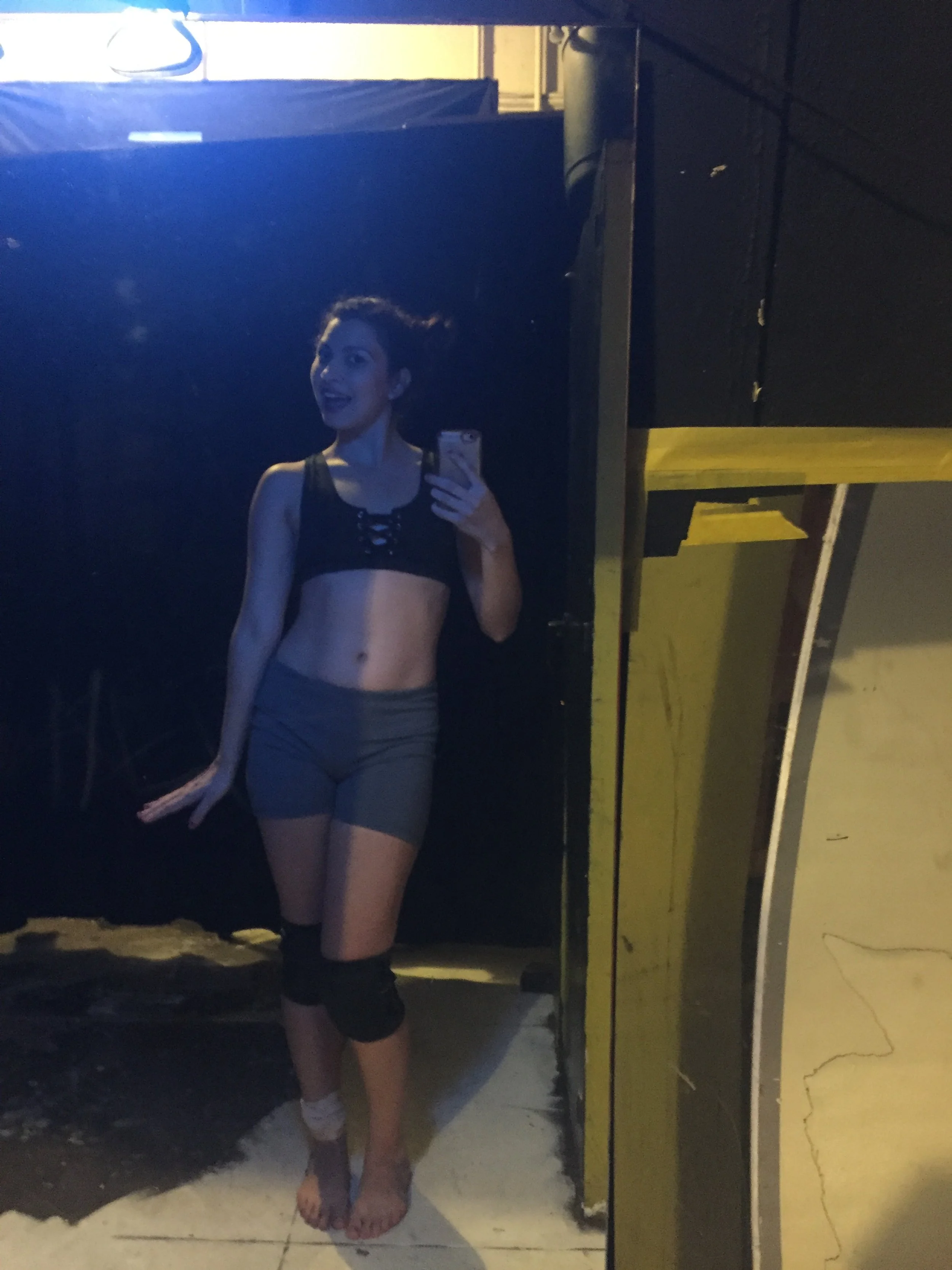 At one point, the curtain was like half up/ half down- I’m in my very cool costume, which consists of these gray tight athletic shorts, a sexy black sports bra and big black knee pads- still one of my absolute favorite costumes- I’m heading backstage and I push the curtain aside to pass by.